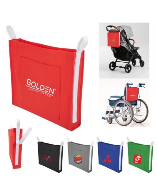 For those who push wheelchairs or strollers, these attachable custom tote bags will be a convenience they will not be able to live without. Built in hook and loop strips allow the sides of this non-woven promotional pouch to be attached to handles so that carrying or accessing items is a breeze. A front slip pocket is perfect for small items such as keys or grocery lists, and the strips are long enough so that the bag could be attached in a variety of places. Attach to car headrests for using as a trash receptacle, or place on kitchen chairs for storing toys or bibs. Made of 100 gsm non-woven and coated for added water resistance.