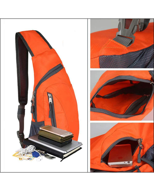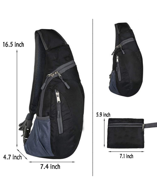 Crossbody backpack is made of 230D polyester & mesh with zipper closure. It can be folded into the interior zipper pouch, lightweight and portable. It has enough room for all your essentials such as umbrella, IPad Mini, phone, wallet, credit card, headphone, earphone etc. It is great for Cycling, Walking, Hiking, Camping, Fishing, Running, and so on.