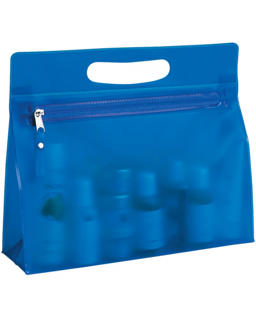 Vanity bag is made of PVC with die cut handle & zipper closure. It is great for makeup, travel amenities, toothpaste, etc. Whether your customers are tossing this in their suitcase for simple travel or leave it sitting on their vanity at home for organization, this bag will certainly come in handy. It has a handle for easy carrying and a zipper closure. Custom logo is available.