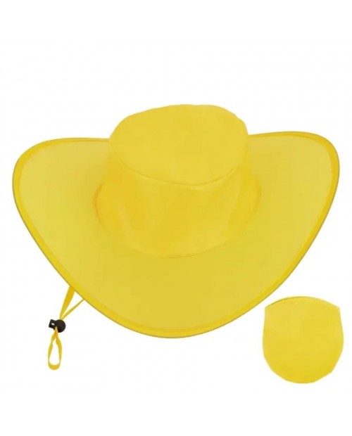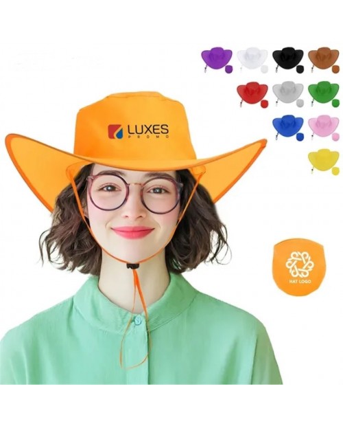 This foldable cowboy hat delivers standout style and functionality in one. Made from durable 190T polyester, it easily twists into a matching pouch for portable storage. With its wide brim offering great sun coverage, it's a fun and practical choice for outdoor events, festivals, or western-themed promotions.
