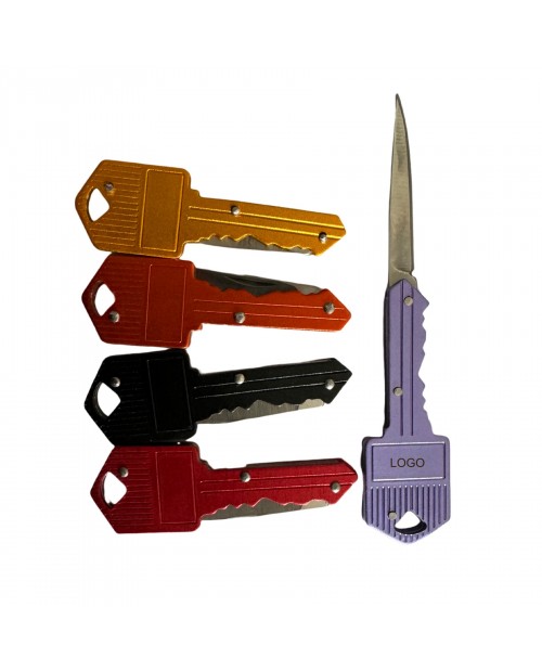Key shaped knife is made of metal. It is designed to resemble a common household key while incorporating a hidden blade. These knives are often designed for convenience and portability, allowing users to carry them on a keychain or in a pocket without drawing attention. It is commonly used for tasks such as opening packages, cutting threads, or performing light cutting tasks. Custom logo is available.