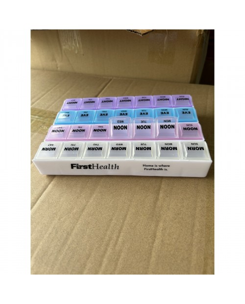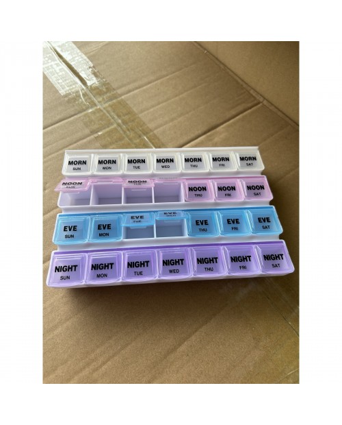 Weekly pill planner is made of PP. Pill organizer includes 28 compartments. It is easy to carry, making them convenient for travel, work, or other daily activities. Custom logo is available.