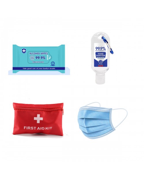 • Personal protective kit includes 10pcs disposable mask, 10pcs alcohol wipes and 60ml hand sanitizer. It is packed into polyester bag.